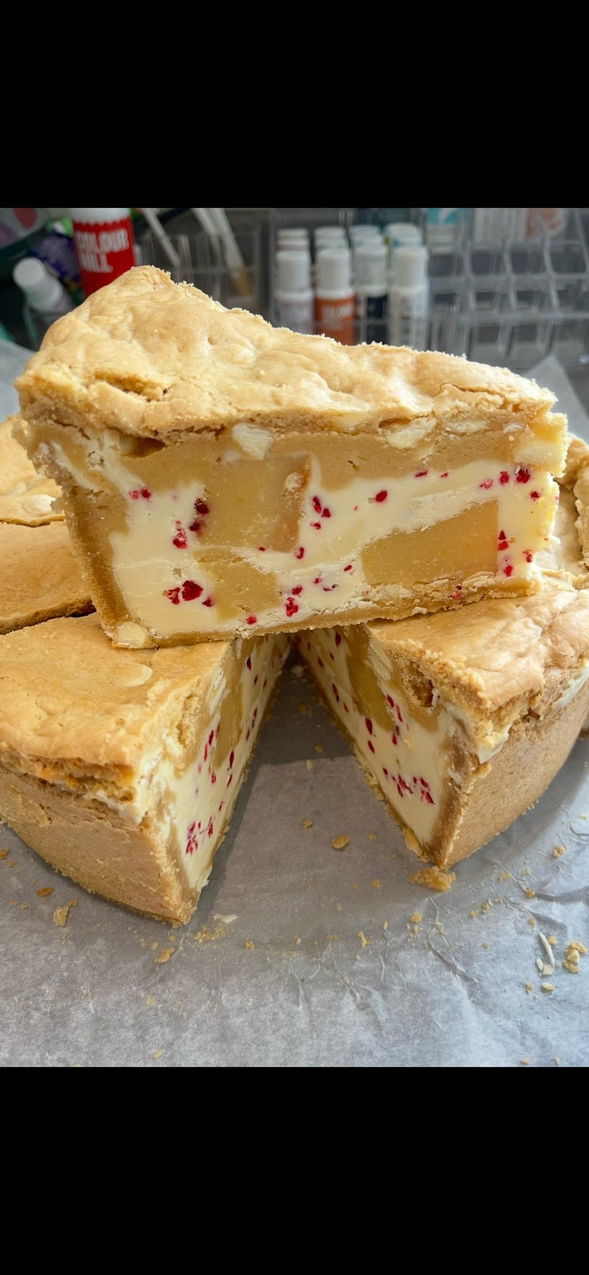 A white chocolate cookie pie filled with raspberry, milky bar and blondieee